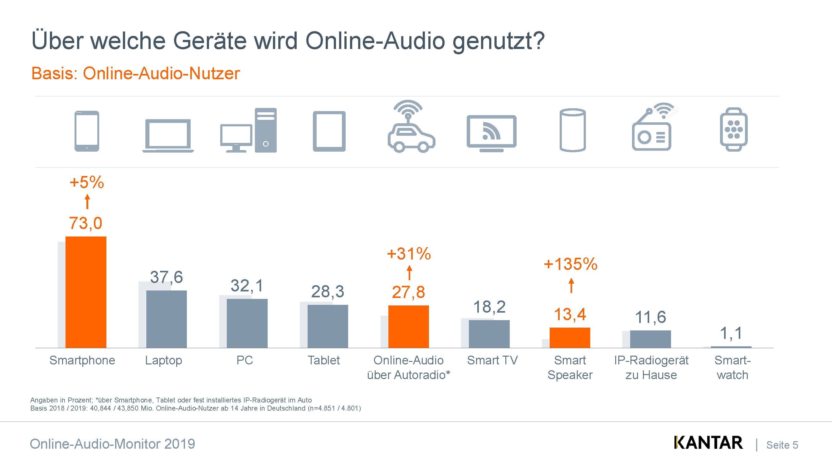 Generell lässt sich sagen, dass mittlerweile fast zwei Drittel der deutschen Bevölkerung Online-Audio-Angeboten nutzen. Dies entspricht einem Zuwachs von drei Millionen im Vergleich zum Vorjahr.